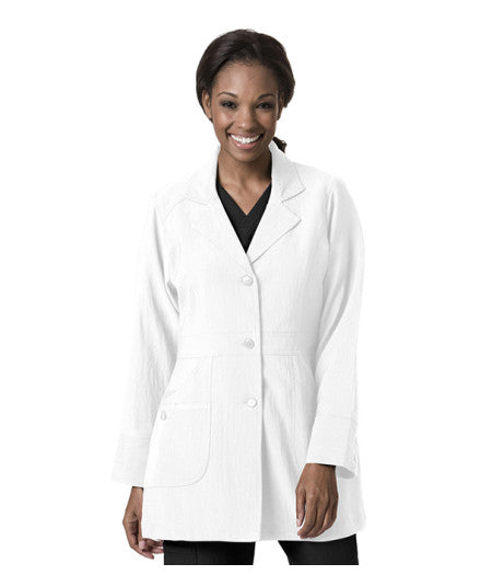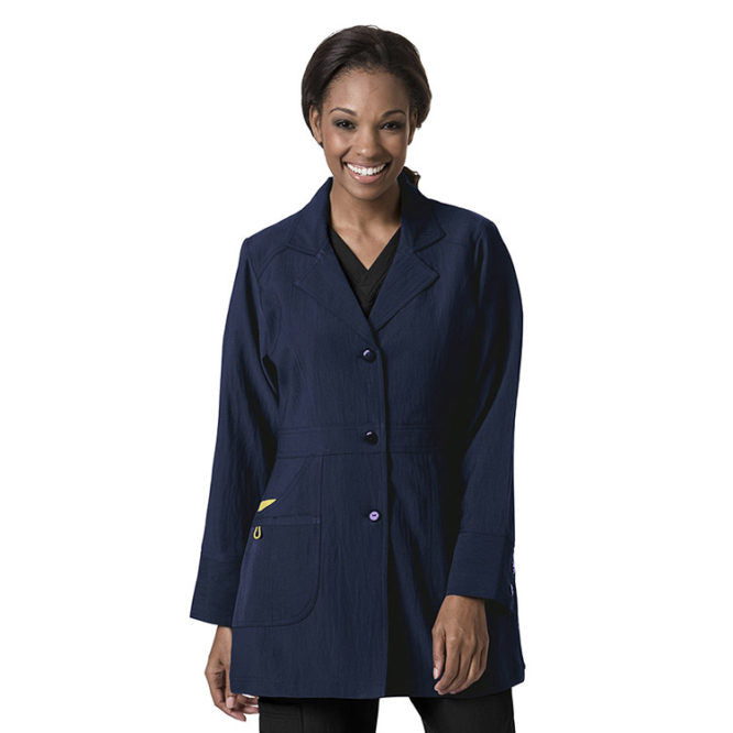 Cuenta con solapa tipo blazer, cierre frontal de tres botones, cinturilla trasera ajustable y bolsillos amplios con compartimientos prácticos. Es una prenda ideal para profesionales de la salud que buscan proyectar una imagen elegante y moderna en su entorno de trabajo.